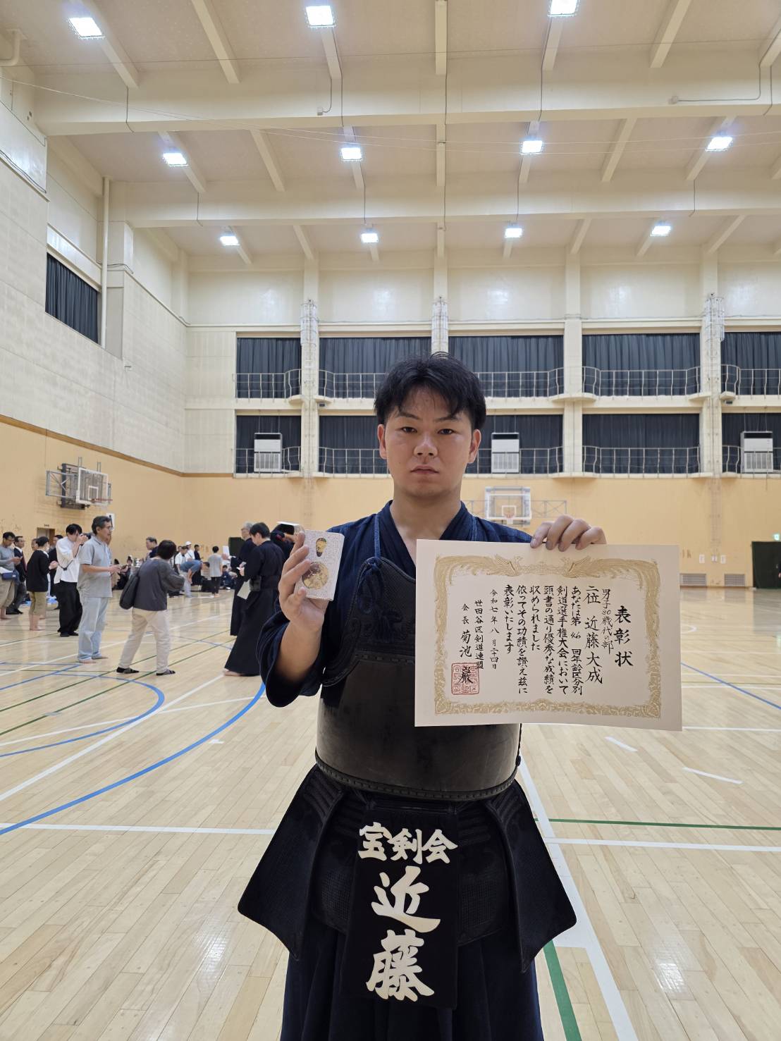 当会からは選手や係員として多くのメンバーが参加した大会。個人戦では2名がベスト8と健闘する中、男子団体は決勝に進出し、勝ち数で並んだものの1本差の僅差での準優勝と素晴らしい成績を残しました。宝剣会チームの熱い戦いに会場は異様な盛り上がりを見せ、会員に勇気と自信を与える1日となりました。